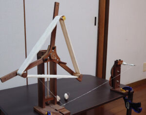 まず、紡ぎ終えたツムを再び糸紡ぎ機にセットし、新しく作ったかせ取り機で巻き取っていきます。