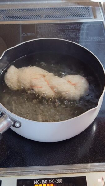 10〜15分ほど茹でたら、水で軽くすすいで絞ります。