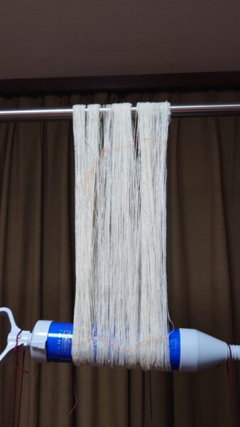 巻き終わったらかせ取り機から外し、よりのかかっている方向へねじって整え、反対側の端にある輪っかに通して形を整えます。