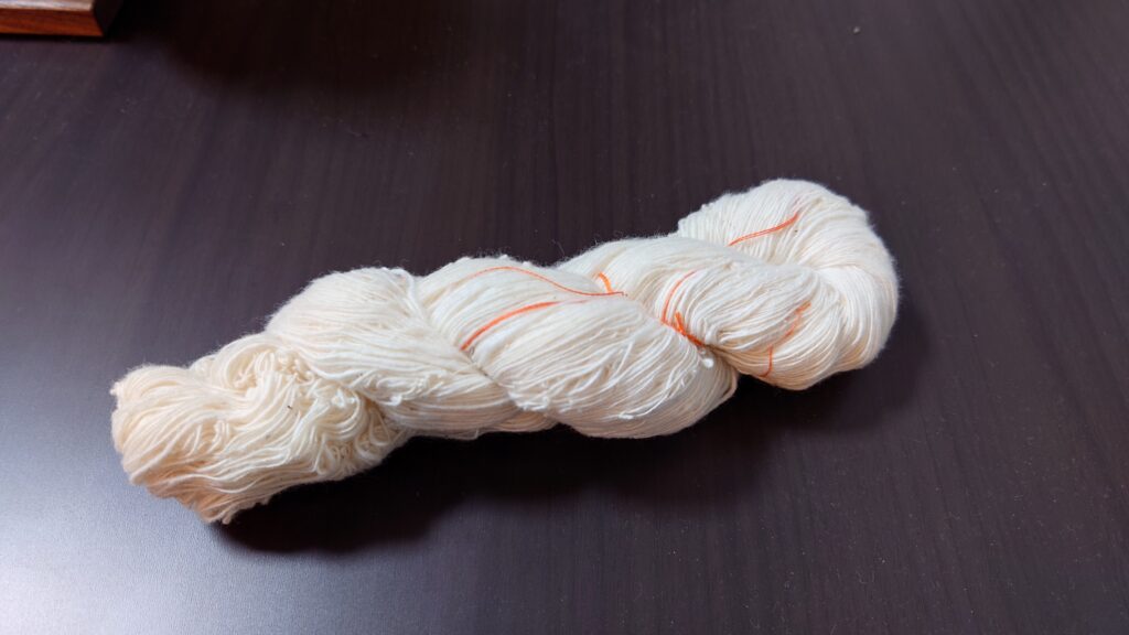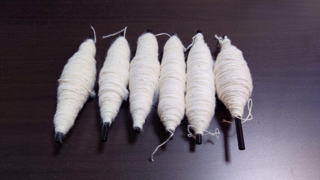 6本できたツムを「かせ(単糸)」にしていきます。 まず、紡ぎ終えたツムを再び糸紡ぎ機にセットし、新しく作ったかせ取り機で巻き取っていきます。 中央のハンドルを回しながら巻いていき、糸のつなぎ目は「はた結び」でつなぎます。 […]